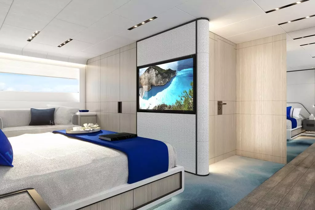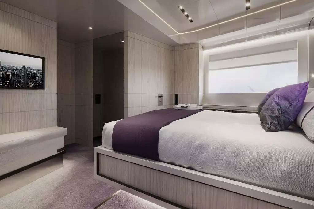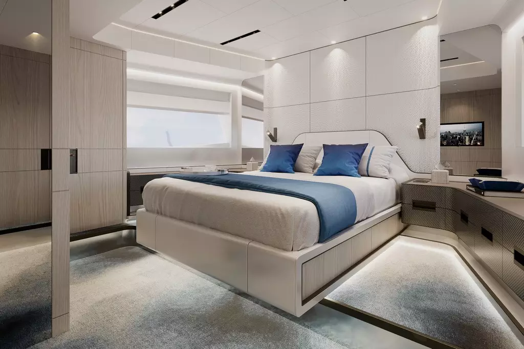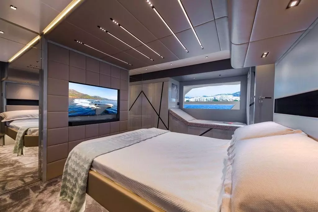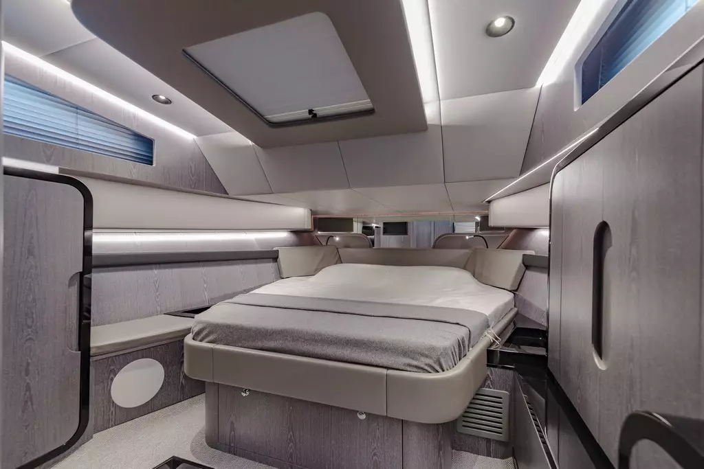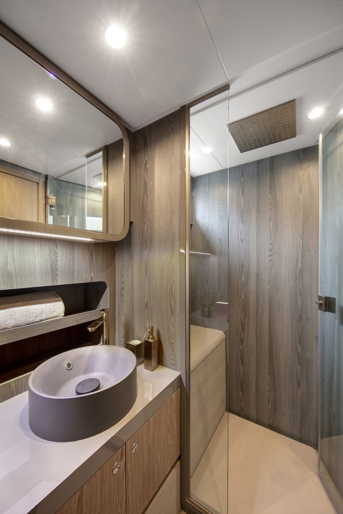 Down below, the boat is offered either with three cabins and a home cinema or four cabins. Hull number one will be a four-cabin layout with the full beam master in the centre of the boat, two twins on each side and the VIP at the bow.