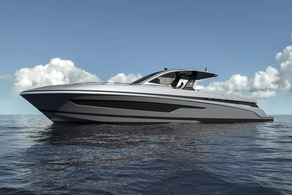 The base-model power will be twin 725-horsepower Volvo Penta D11s. Options will include triple or quadruple 600-horsepower Mercury V12s. Range is expected to be 240 to 350 nautical miles at cruising speeds. Construction will be vacuum-bagged E-glass with carbon-fibre components, including the hardtop.