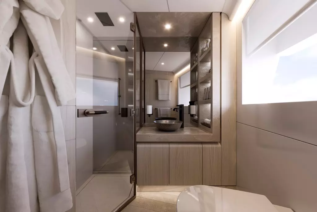 She is available in two versions: two cabins + crew cabin or three cabins + crew cabin. Interiors are built lightweight with extensive use of carbon fibre, foam cored anti-noise and vibration pavement and high-tech honeycomb furniture production process by iconic Canados cabinetry makers. With a beam of 4,73 m /15’6”, the widebody owner’s suite offers ample spaces.