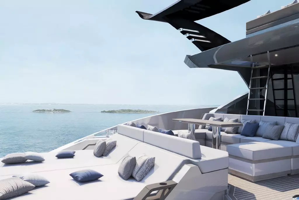 New features will include a reverse sofa above the swim platform for clients who like water sports; side lockers for cockpit fenders; built-in reverse armchairs forward; and a sizable tender garage.